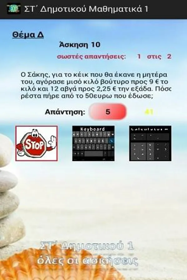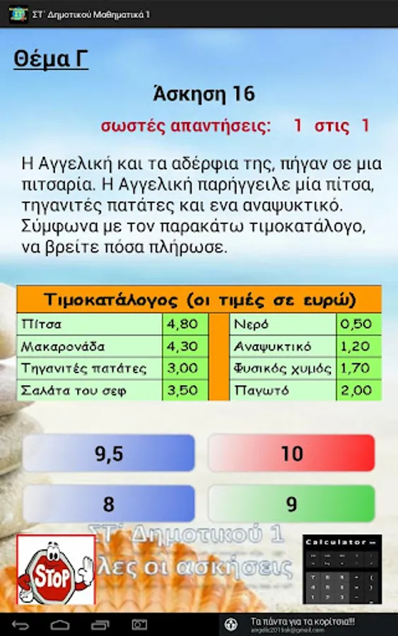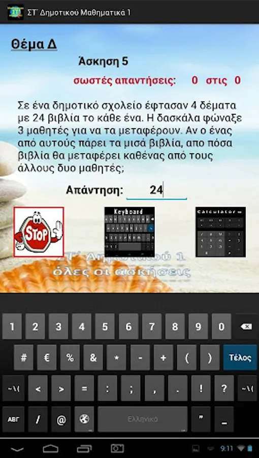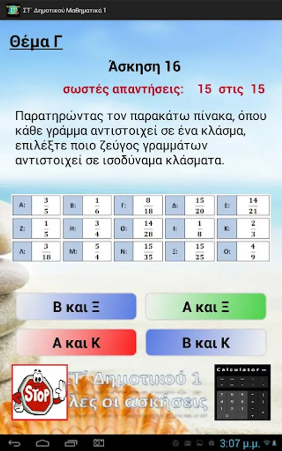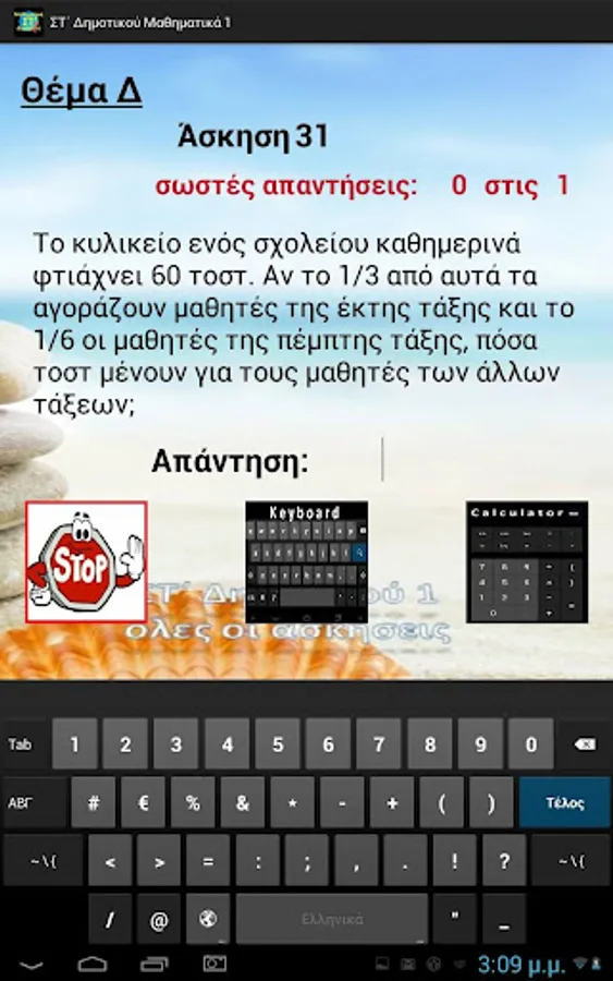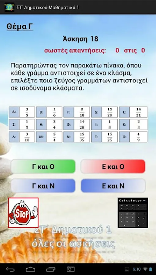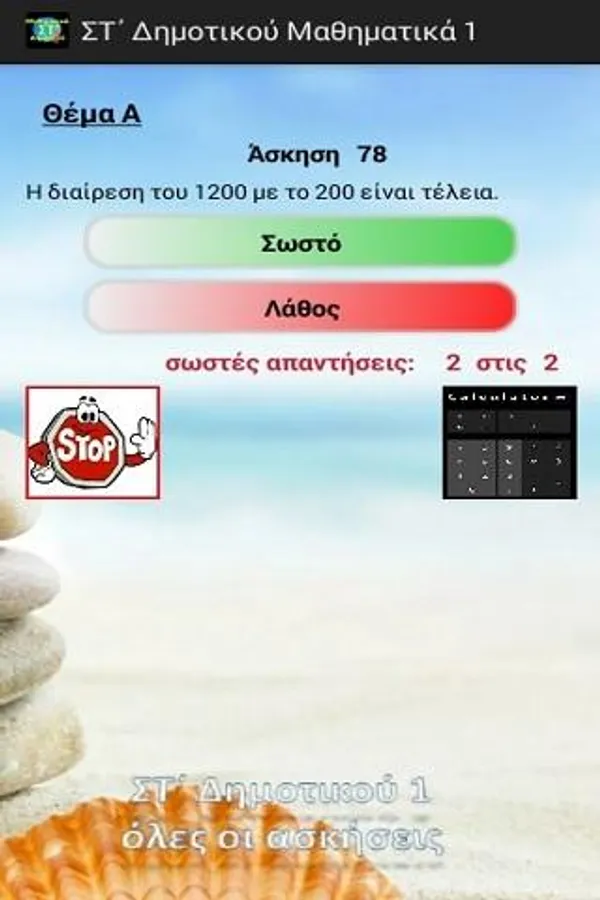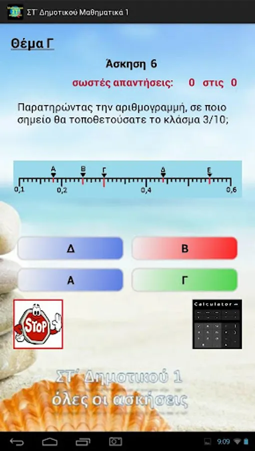 The student can repeat the modules he wants by practicing only the exercises of a subject. With all the exercises stored on the base, for example, as Topic A. All of the Correct-Wrong suggestions, or those who want them, since there is a STOP button to end the process. Because access in this case is serial, it is possible to continue at some other time practicing the exercises, from where it stopped. So he can slowly deal with all the exercises of the application. Similarly, it can deal with all, or those who like, the exercises of Topic B, Multiple Choice, Topic C Multiple Choice with Image, or Topic D Problem Solving. In this case, the student can also use the built-in calculator for operations.