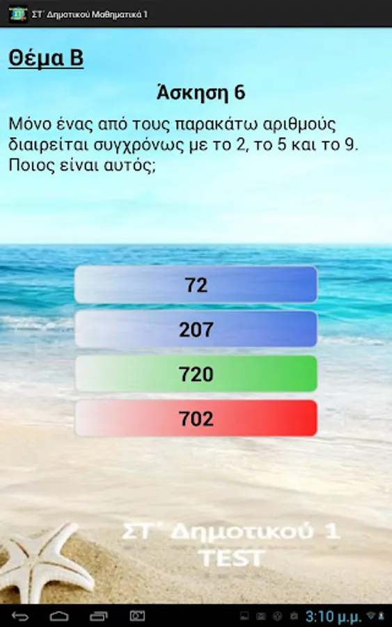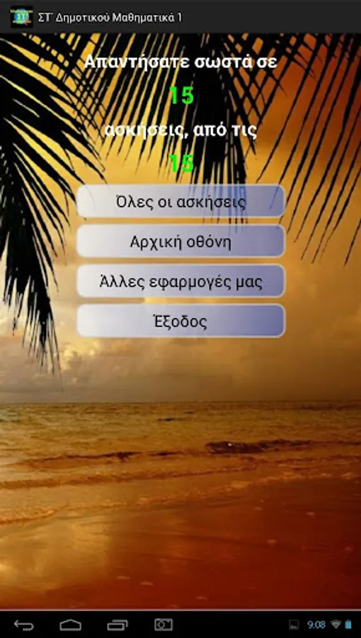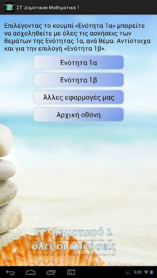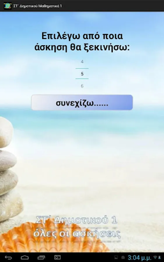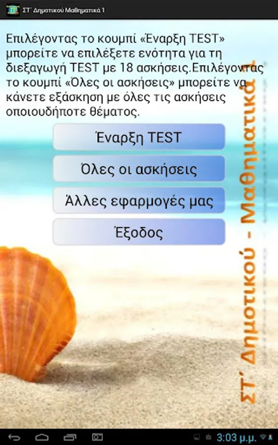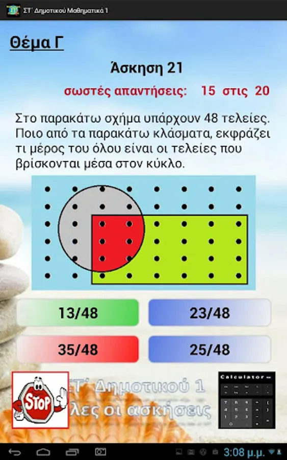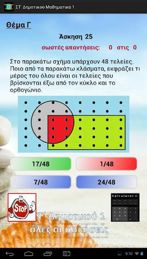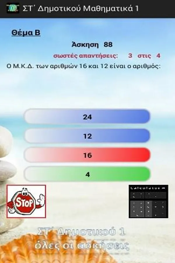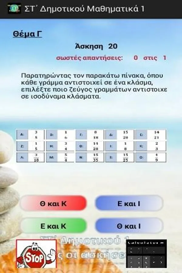 The student can repeat the modules he wants by practicing only the exercises of a subject. With all the exercises stored on the base, for example, as Topic A. All of the Correct-Wrong suggestions, or those who want them, since there is a STOP button to end the process. Because access in this case is serial, it is possible to continue at some other time practicing the exercises, from where it stopped. So he can slowly deal with all the exercises of the application. Similarly, it can deal with all, or those who like, the exercises of Topic B, Multiple Choice, Topic C Multiple Choice with Image, or Topic D Problem Solving. In this case, the student can also use the built-in calculator for operations.