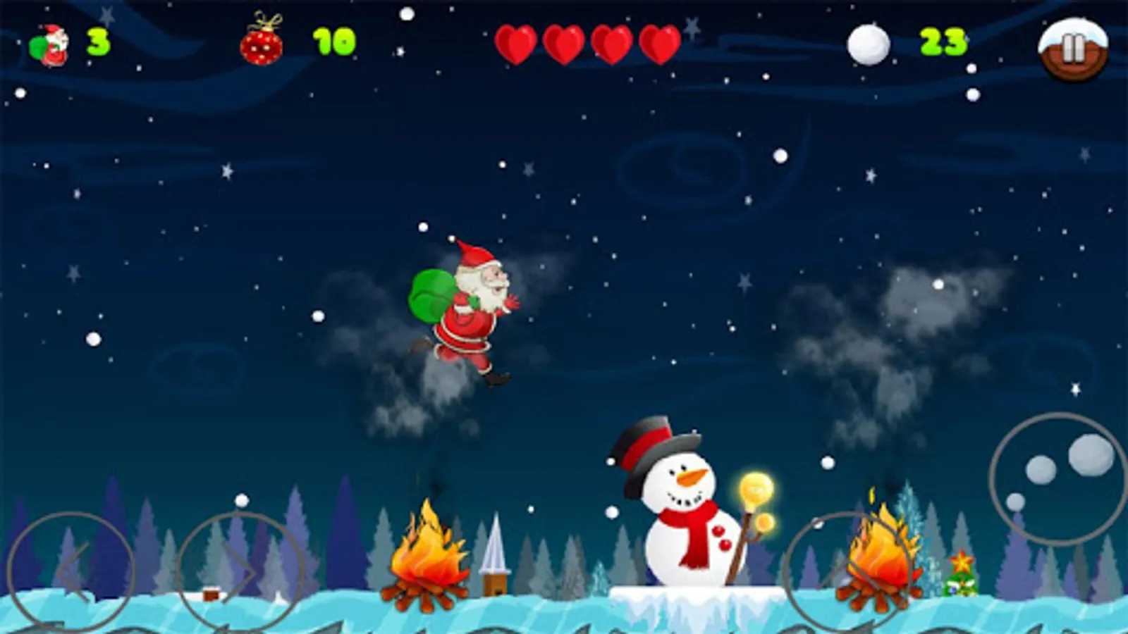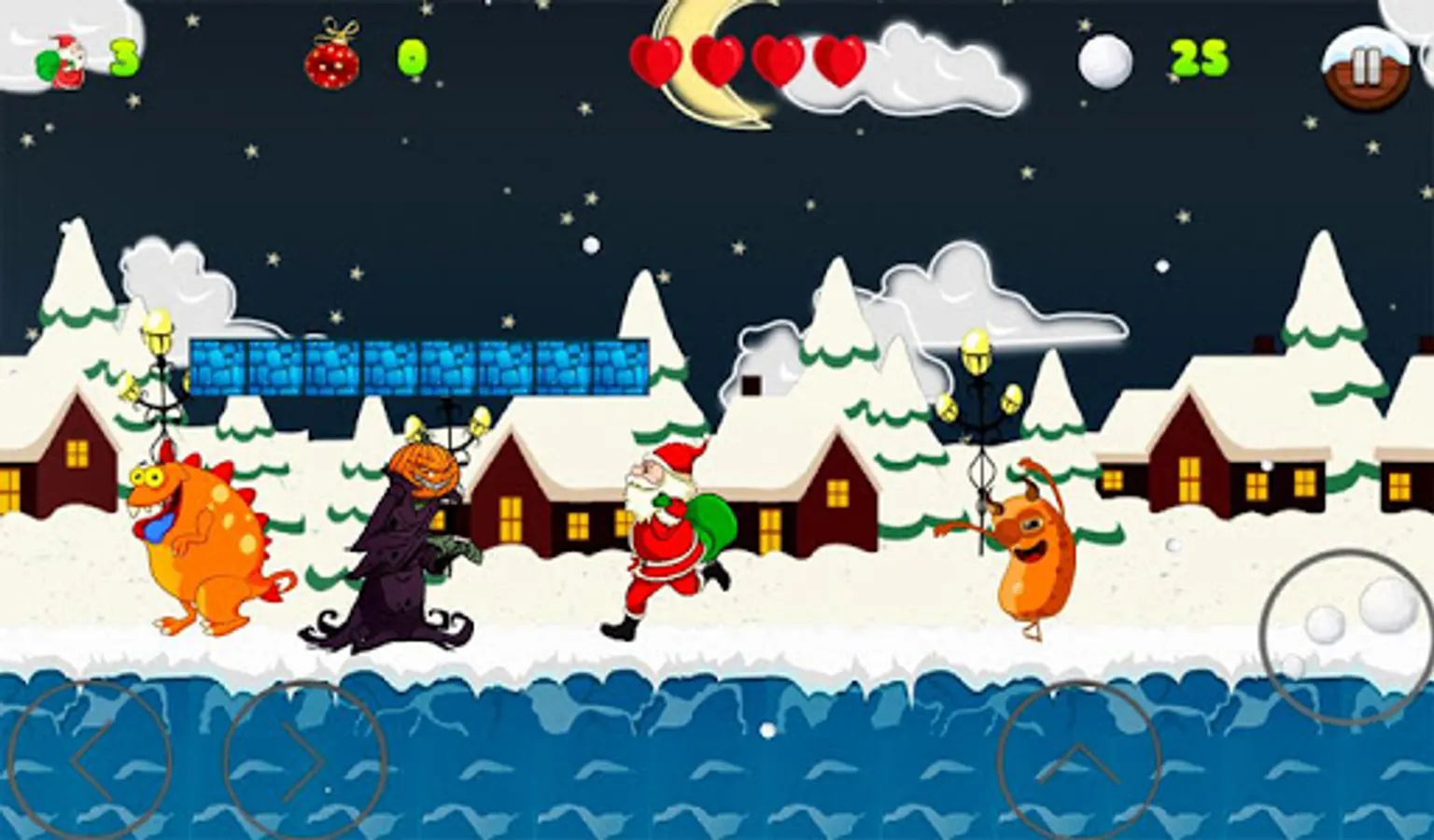 In its pacing and structure, This Christmas Santa adventure game has 3 worlds that contain plot twists dark enemies from Halloween. The adventure game itself consists of 20 levels, and that was made available by winning the levels. Together, Christmas Santa adventure make the best adventure game of the snow winter season. Additionally, powerup's and the effects in the Santa adventure game makes the gameplay exciting and addictive worth for this Christmas holidays.