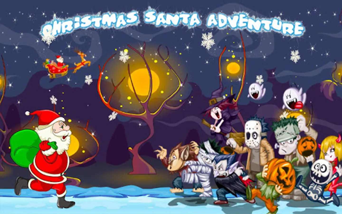 Christmas Santa Adventure!!! is an action-adventure android game developed by STEM studios, released for the Android devices. The story follows its again a Christmas time, our Christmas Santa reach again to deliver gifts to kids but our Santa got inside a Halloween world where Halloween characters chasing our Santa. Our Santa has to face a lot of adventure to reach the kids before Christmas.