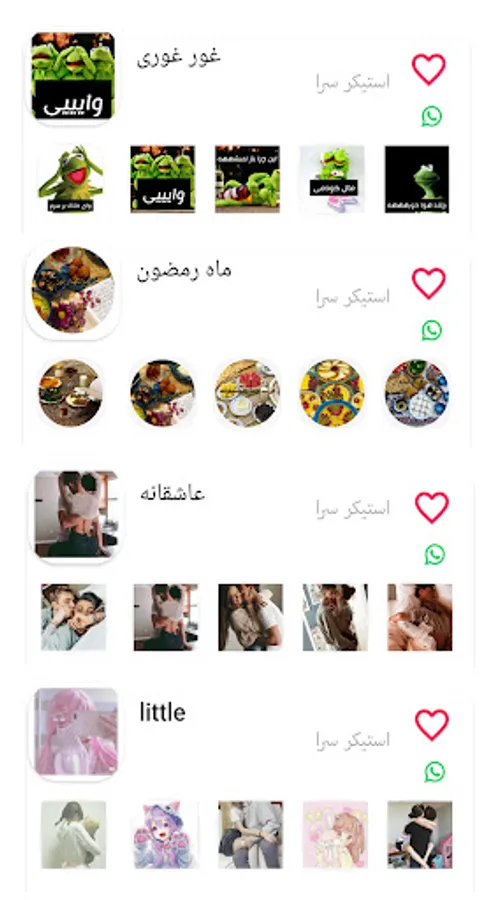 مجموعه ای از انواع استیکرها در استیکر ساز در دسته بندی های متنوع مثل استیکر واتساپ عاشقانه،استیکر واتساپ خنده دار، استیکر واتساپ دخترونه، استیکر واتساپ اسم، استیکر واتساپ شکلک، استیکر واتساپ انگلیسی، استیکر واتساپ عربی و ...