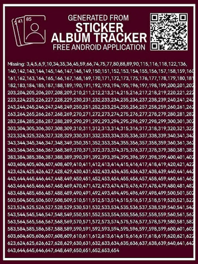 Using this application you can manage your missing stickers of all the albums. It is NOT official and is created for helping collectors to manage their missing and duplicate stickers of any album.
