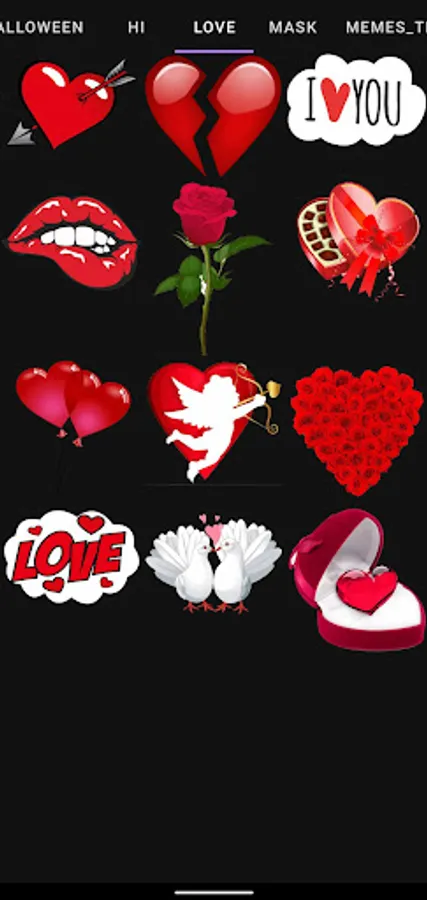 - Decorations and multiple emojis for making stickers look funny and cool: animals, doge, birthdays, Halloween, love, masks, memes, troll faces.