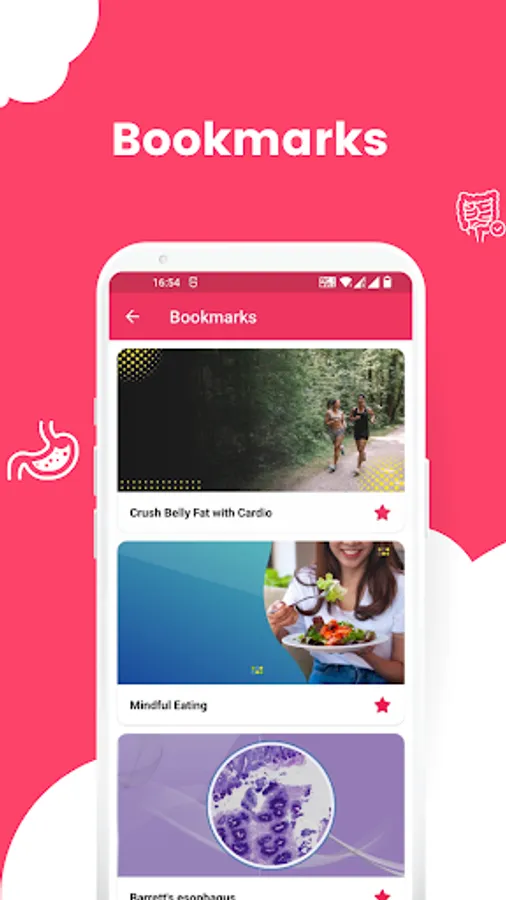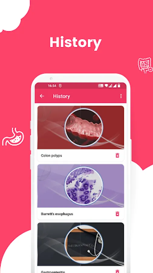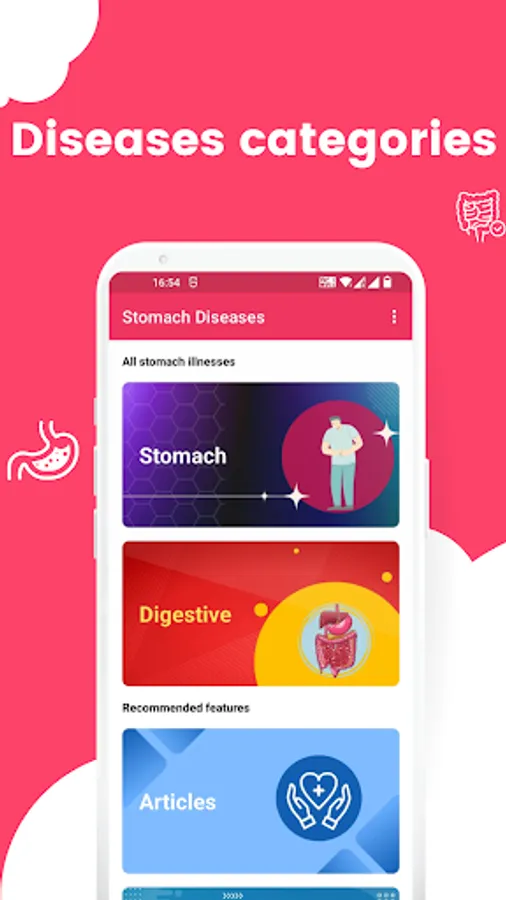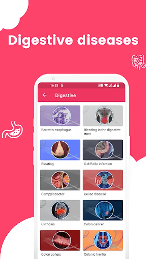 The app covers a wide range of stomach diseases, including Celiac disease, Appendicitis, Barrett's esophagus, Colon Cancer, Bloating, Constipation, Crohn's disease, Cyclic vomiting syndrome, Diarrhea, Diverticulitis, Esophageal cancer, Gastritis, Gastroparesis, Acid reflux, Food poisoning, Gallstones, Ulcerative colitis, Irritable bowel syndrome (IBS), Hemorrhoids, Lactose intolerance, Stomach cancer, Zollinger-Ellison syndrome, and preventing infection at home.