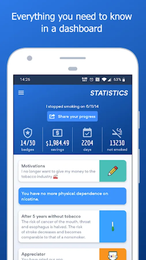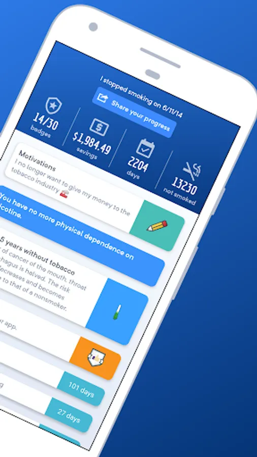 With Qwit, quitting smoking is like a game! You earn medals based on your performance, such as the number of unsmoked cigarettes and the time spent without tobacco. Each medal can be shared on social networks with a single click, so you can celebrate your successes and motivate your friends to quit smoking too.