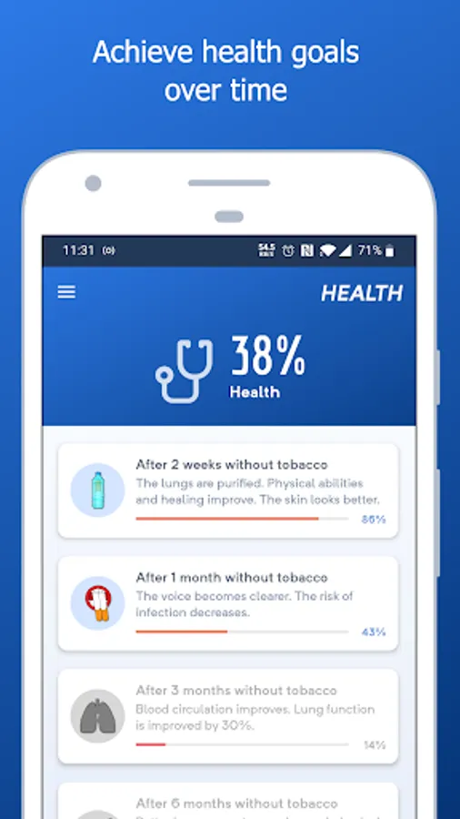 - Health information: Learn about the benefits of quitting smoking, like improved taste and smell, and set health-related targets to complete.