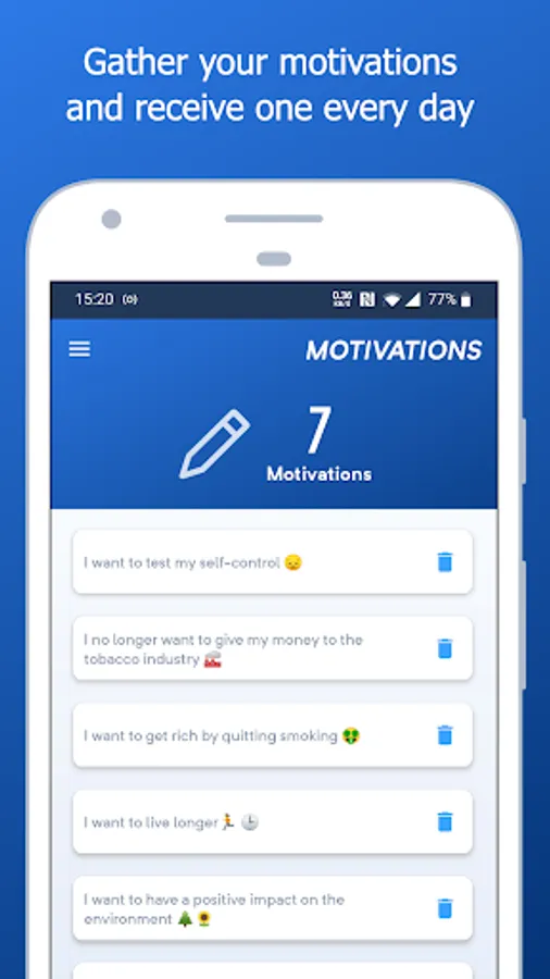- Reminder system: Write your reasons for quitting and get reminded of them every 24 hours in the notifications bar.