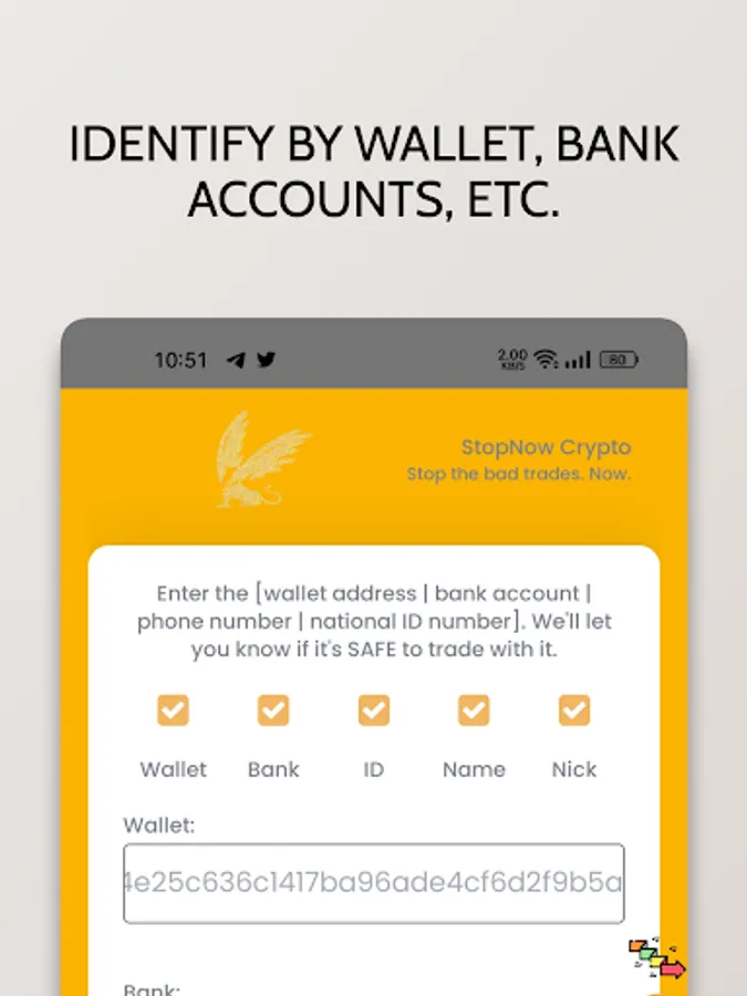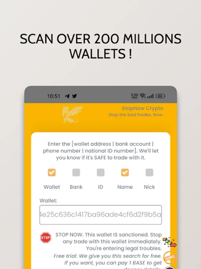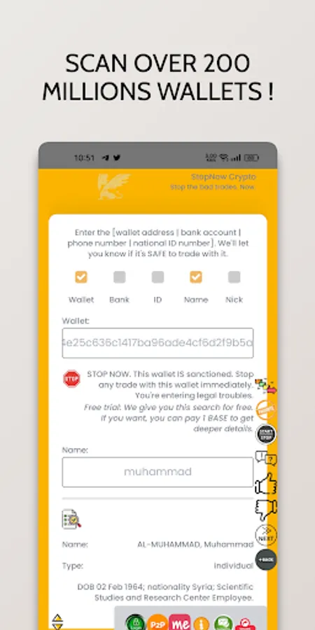 Search +200 million crypto wallets, half a million dangerous, blocked, sanctioned persons, and fraudulent bank-crypto P2P traders. Stay away from troubles. Now.
