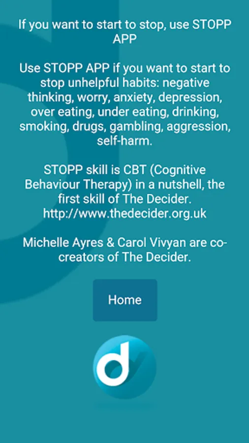 STOPP is the first skill of The Decider (32 skills) and The Decider Life Skills (12 skills). It was initially developed with feedback from clients in adult mental health services. Strongly grounded in theory, the app is always ready to help you make positive choices.