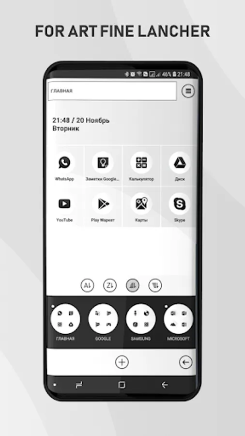 Attention! This theme can be used at "Art Fine Launcher" only. It will not work without this app.