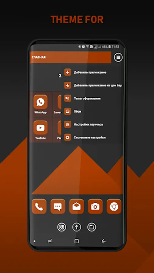 The theme contains icons pack for most popular launchers. List of launchers that support the use of icons pack: Apex launcher, Action launcher, AWD launcher, Evie launcher, Nova launcher, Smart launcher.