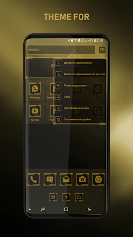 The theme contains icons pack for most popular launchers. List of launchers that support the use of icons pack: Apex launcher, Action launcher, AWD launcher, Evie launcher, Nova launcher, Smart launcher.
