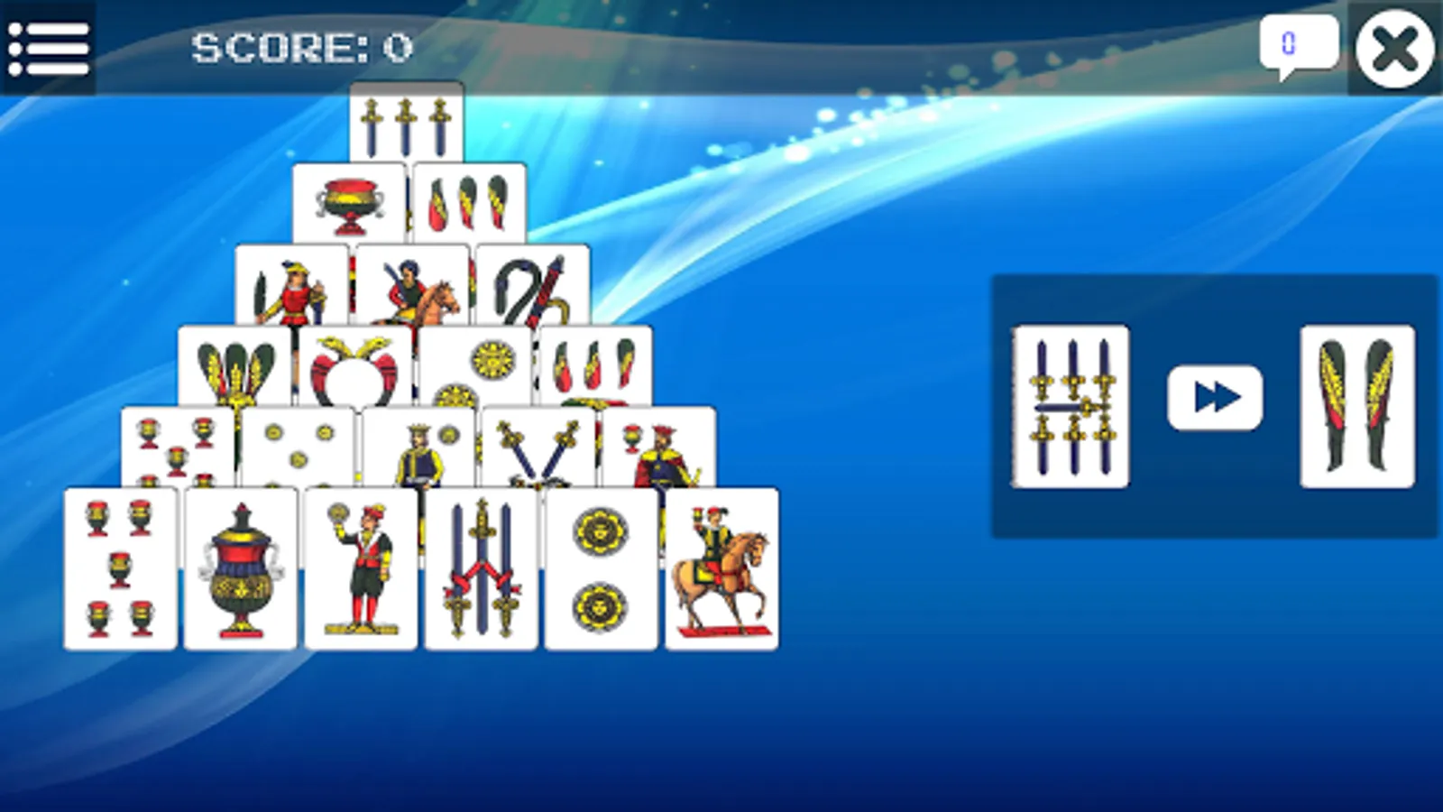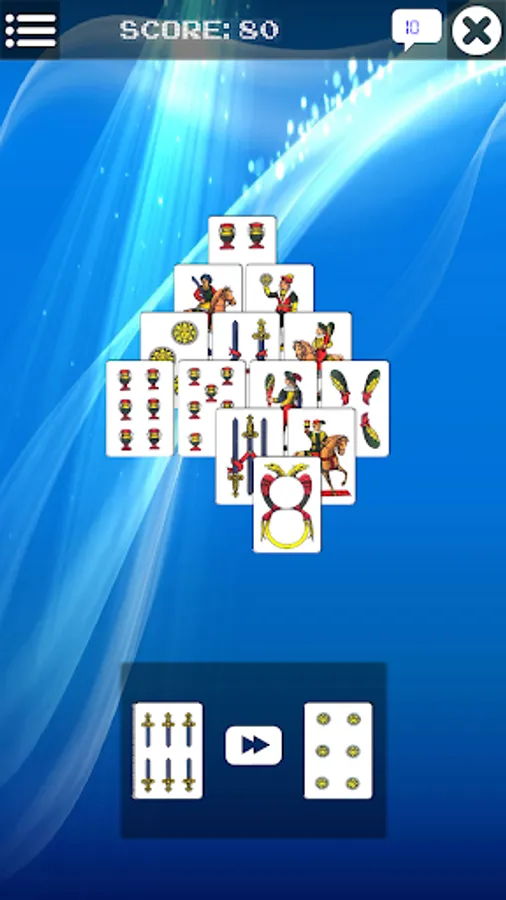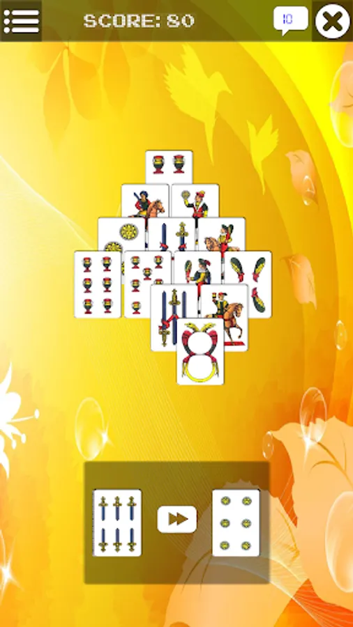 Touch the discovered cards so that the sum of the 2 cards is 10, they will be removed by allowing you to select the ones below. All cards are removed from the pyramid using the same principle, a victory is reported when all the cards have been removed from the pyramid.
