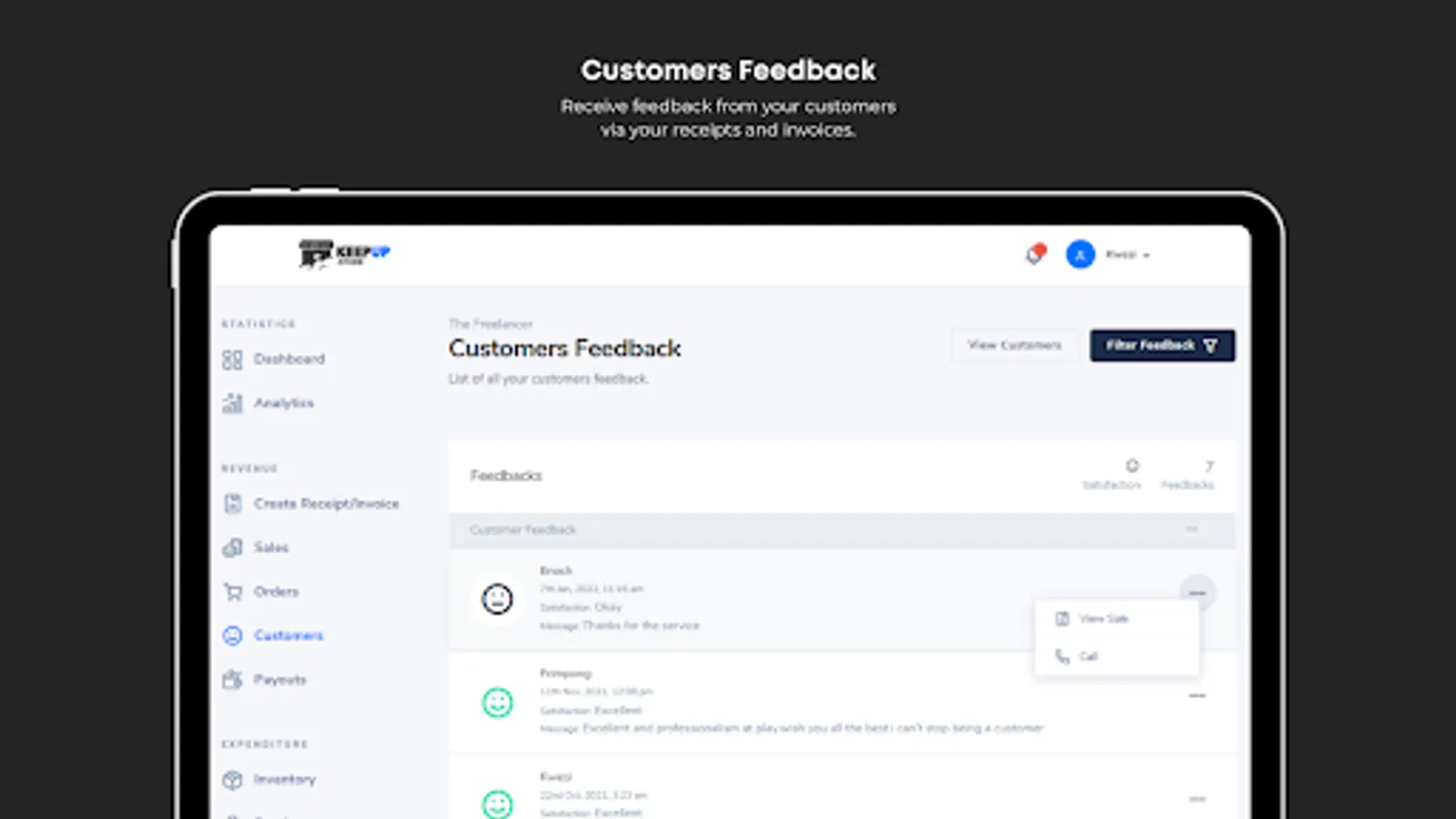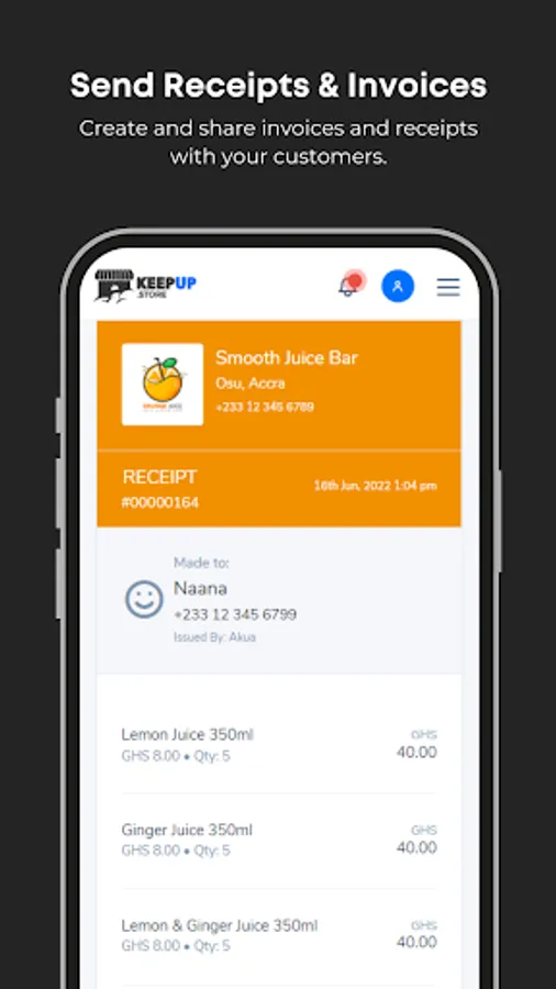 Keep track of your debtors and sales revenue by creating and sending invoices, quotes, and receipts to your customers.
