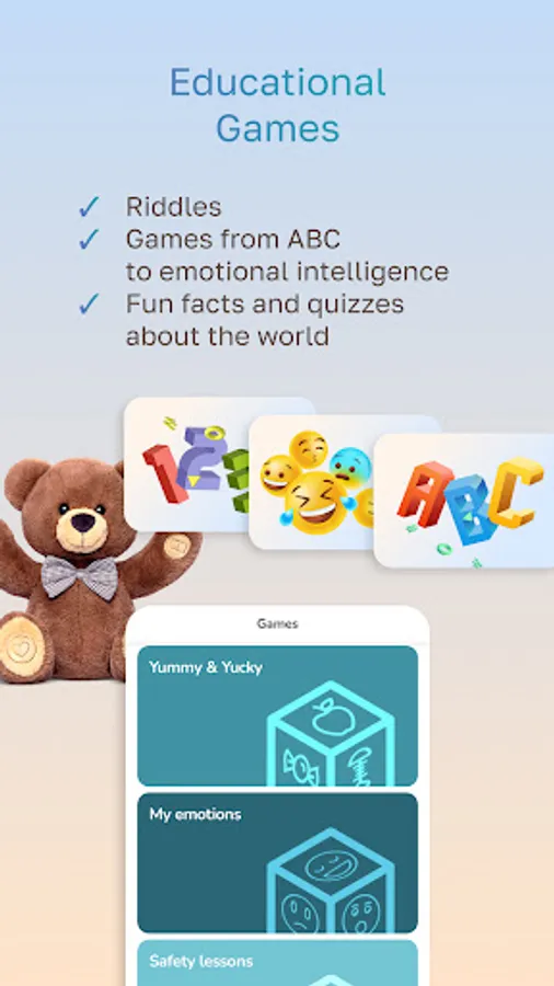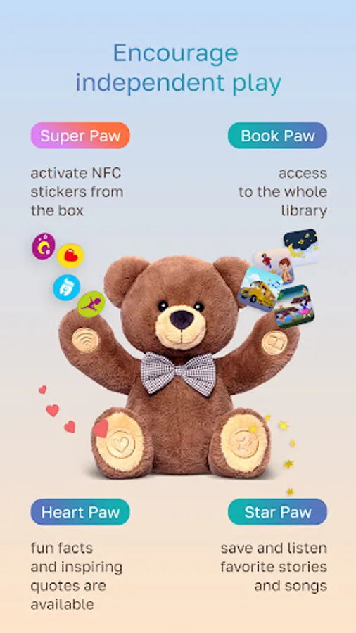 Smart Teddy is a great storyteller for bedtime, with lullabies, songs, and poems. It helps develop your child's skills and turn learning into a fun game.