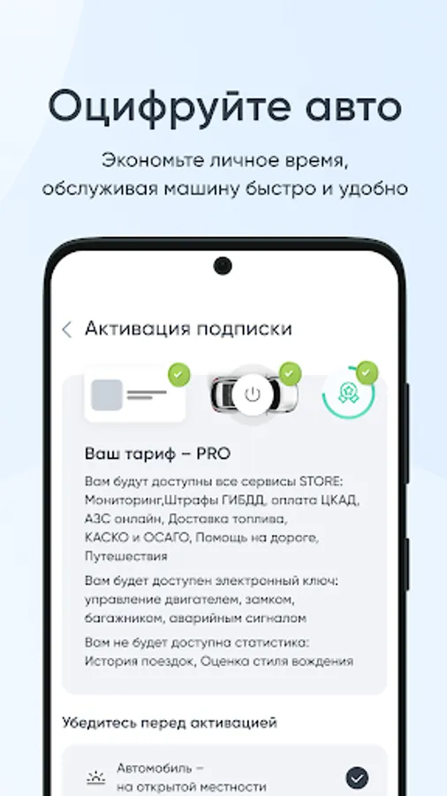 The TES.STORE application (testor) will allow you to always be in touch with your car: remote engine start, central locking and trunk control, emergency signal and headlights.