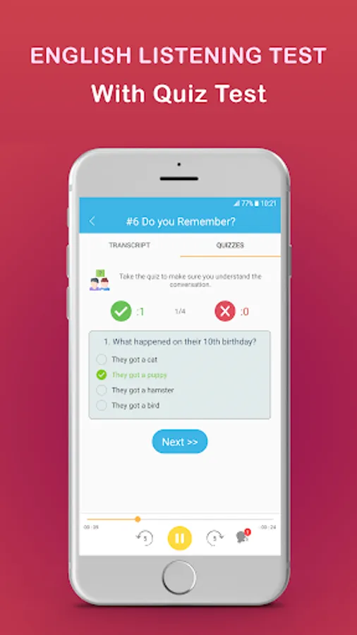 - English listening test with English quiz test.