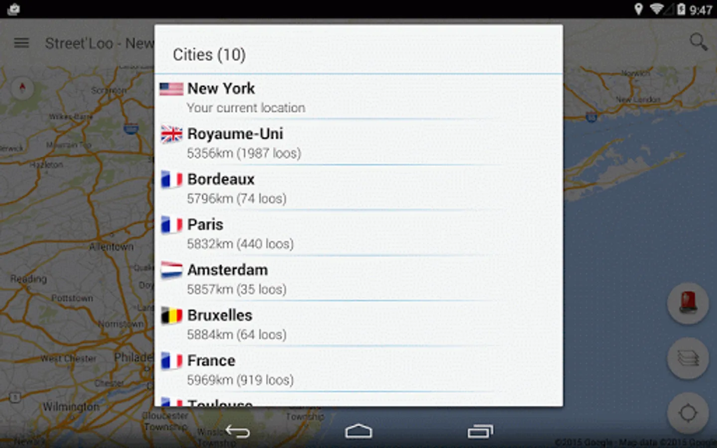 Find at a glance the nearest public toilet in Paris, Bordeaux, Toulouse or on highway (France), Bruxelles (Belgium), Amsterdam (Netherlands), Sydney, Perth, Adelaide, Brisbane, Darwin, Cairns, Melbourne, National Parks (Oz, Aussie, Australia), London (England), Wien (Austria), New York (United states)