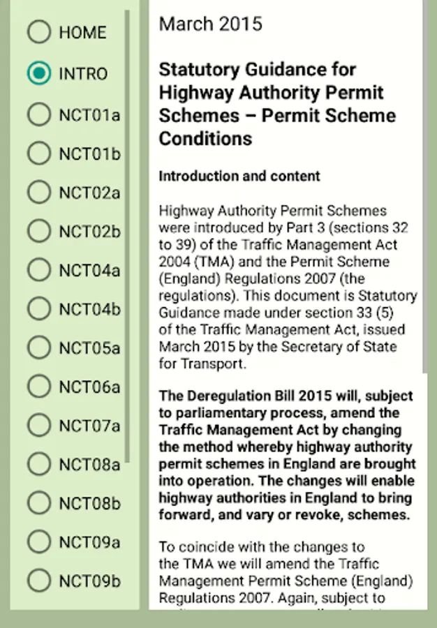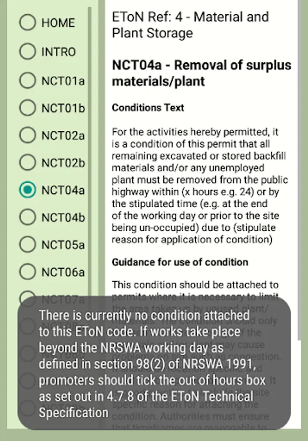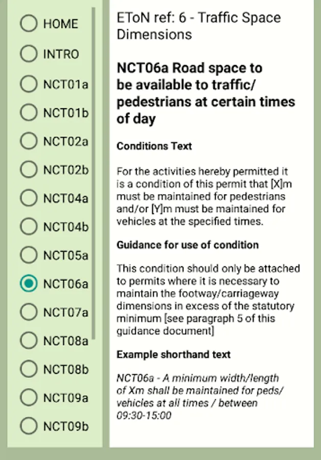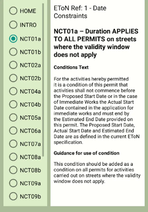This app is designed for statutory undertakers and local authorities to easily find the relevant information for the appropriate Street Works National Conditions (NCTs) for electronic permit applications to undertake road works in the UK.
