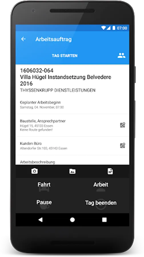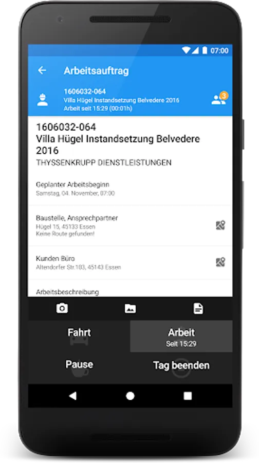 The timekeeping can with the mobile time clock with a few clicks on the businesses (driving time, working time and pause time), and dynamically map the column structure with respect to a work order. Working hours are checked for plausibility.