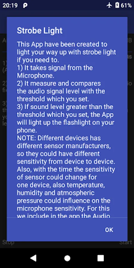* Different devices has different sensor manufacturers, so they could have different sensitivity from device to device. Also, with the time the sensitivity of sensor could change for one device, also temperature, humidity and atmospheric pressure could influence on the microphone sensitivity. For this we include in the app the Audio Sensor Sensitivity Adjustment via the Audio Sensor Threshold seekbar widget.