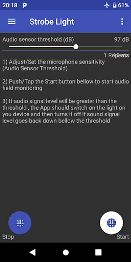 3) If sound level greater than the threshold which you set, the App will light up the flashlight on your phone.