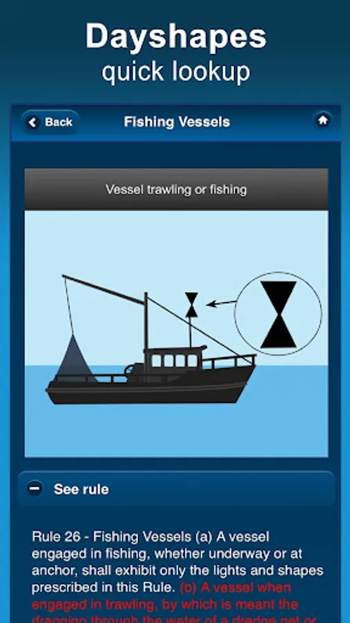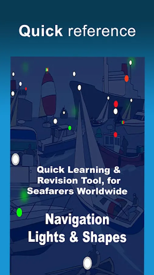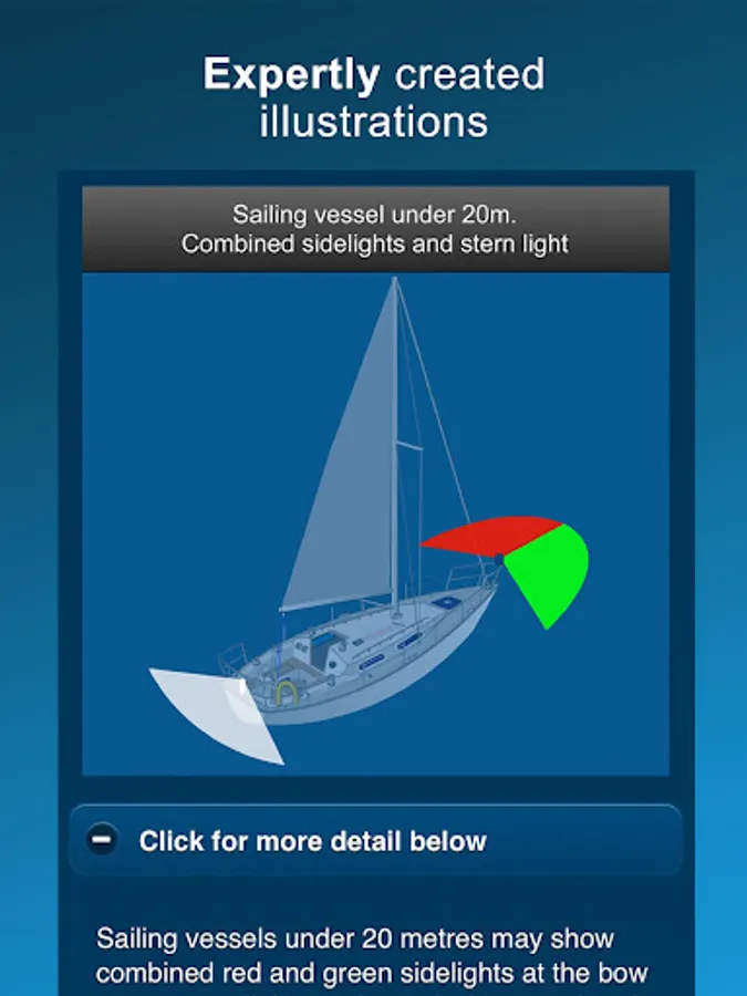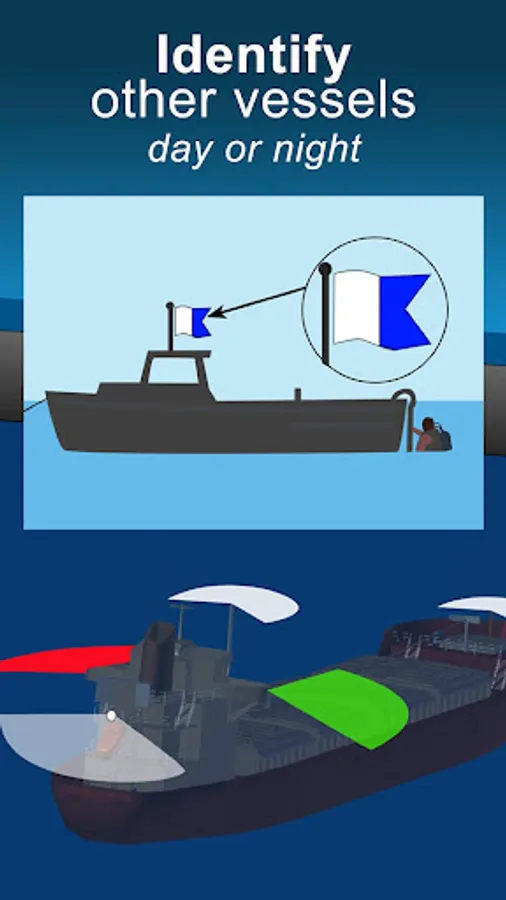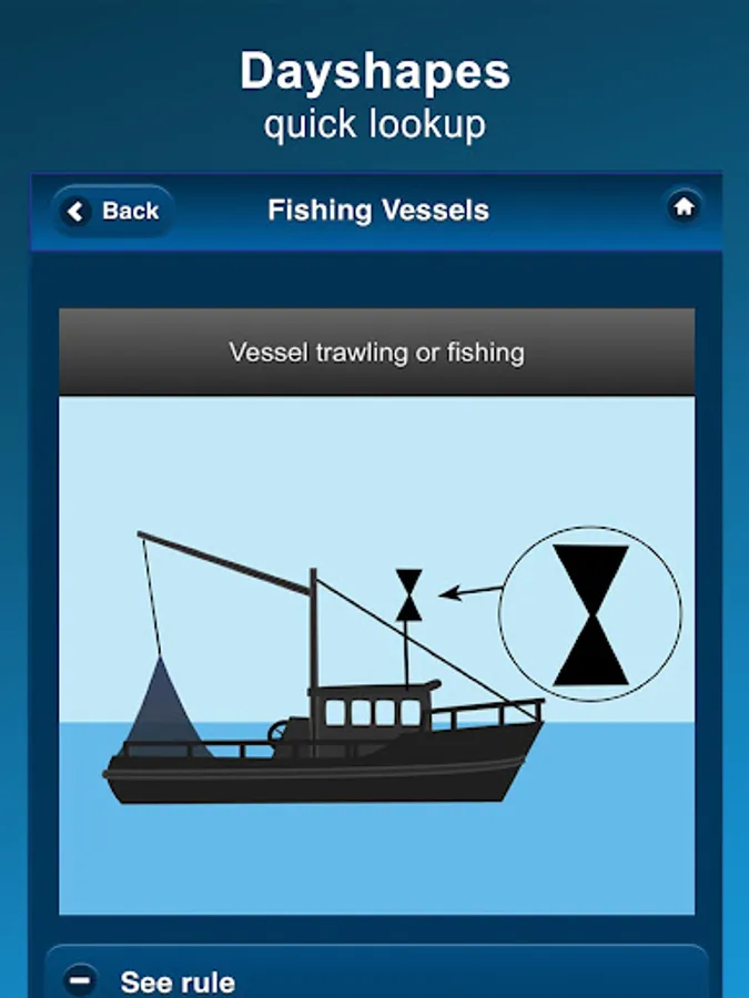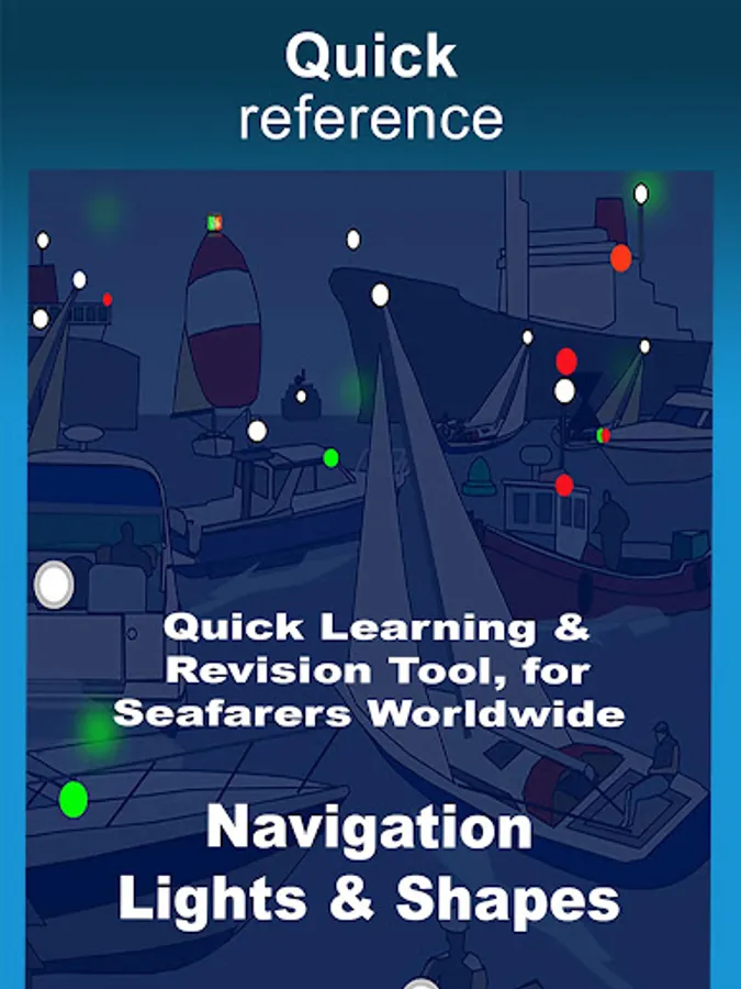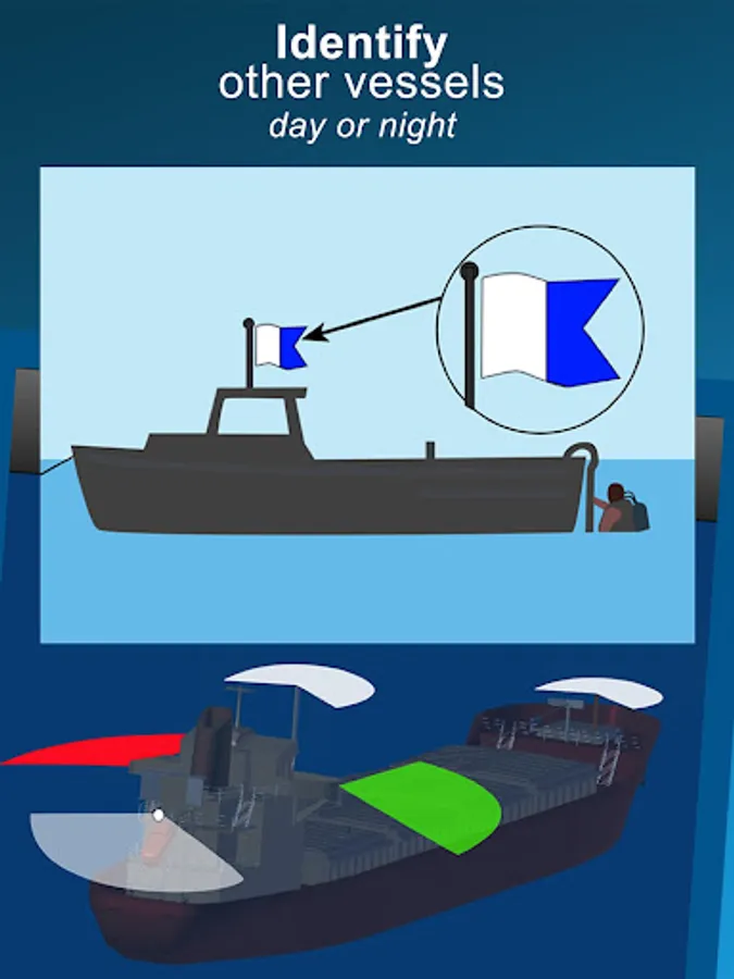 Quick learning & revision tool, over 100 graphics, for all seafarers - this sailing, boating & marine nautical app provides all sailors, boaters & fishermen with essential quick reference knowledge to help them identify vessels and the activities they are engaged in, as specified by the ColRegs.