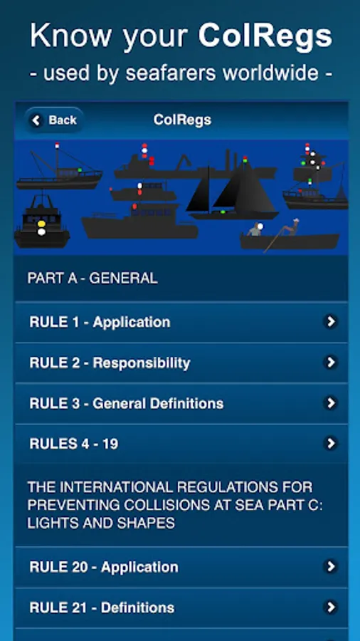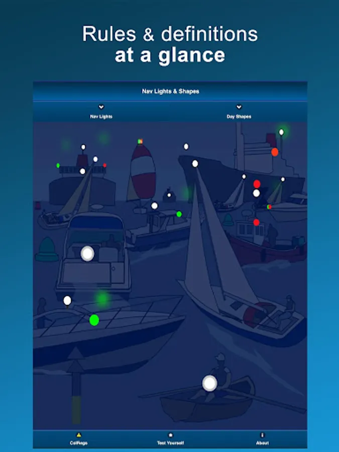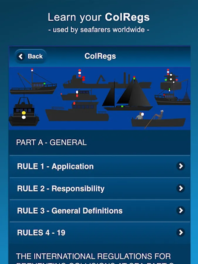 Whether out on the water or on shore, in daylight, darkness or poor visibility, simply open the app and search the rules in seconds to find the appropriate ColRegs rule and definition.