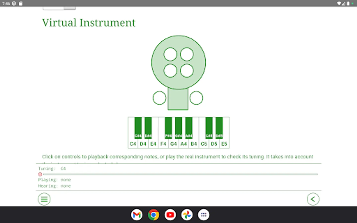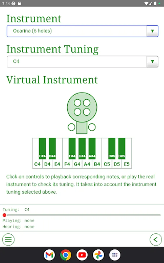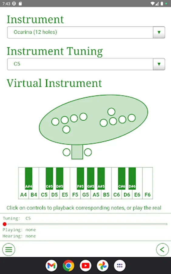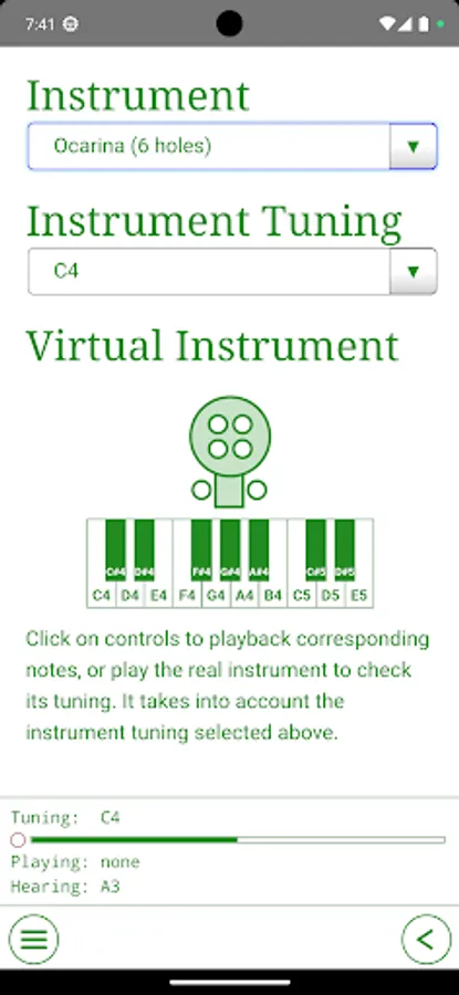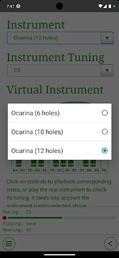 - Selection between 12-, 10- and 6-hole ocarina, and various instrument tunings;