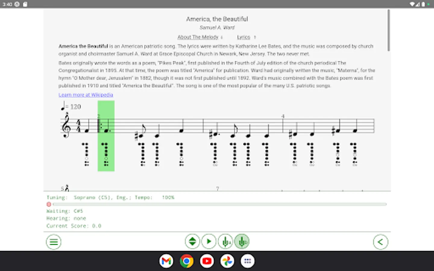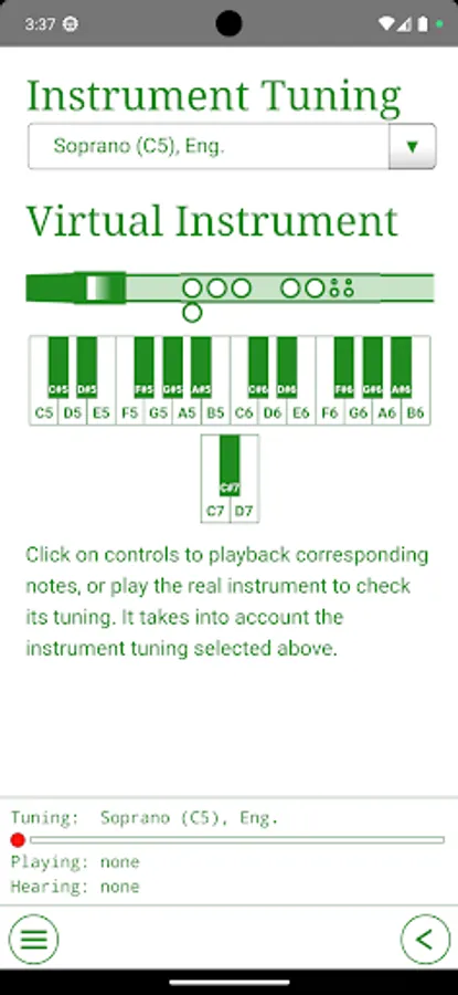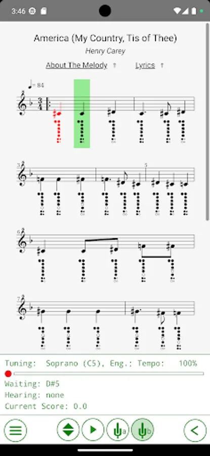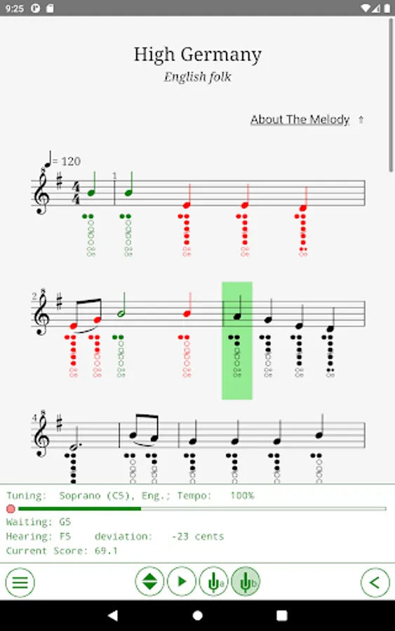 - Interactive training modes (recognition via the microphone of the music you play on a real world recorder, and scoring it against the music sheet);