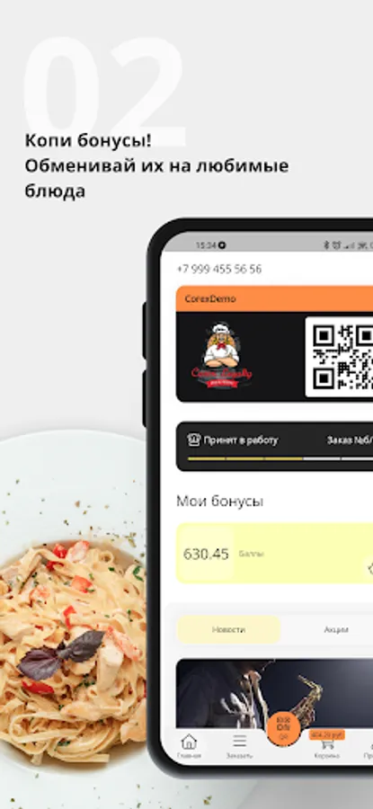 This application demonstrates the functionality of our Corex.Loyalty system. Here you can see the work with loyalty cards, points, news, as well as place an order for delivery or pickup.