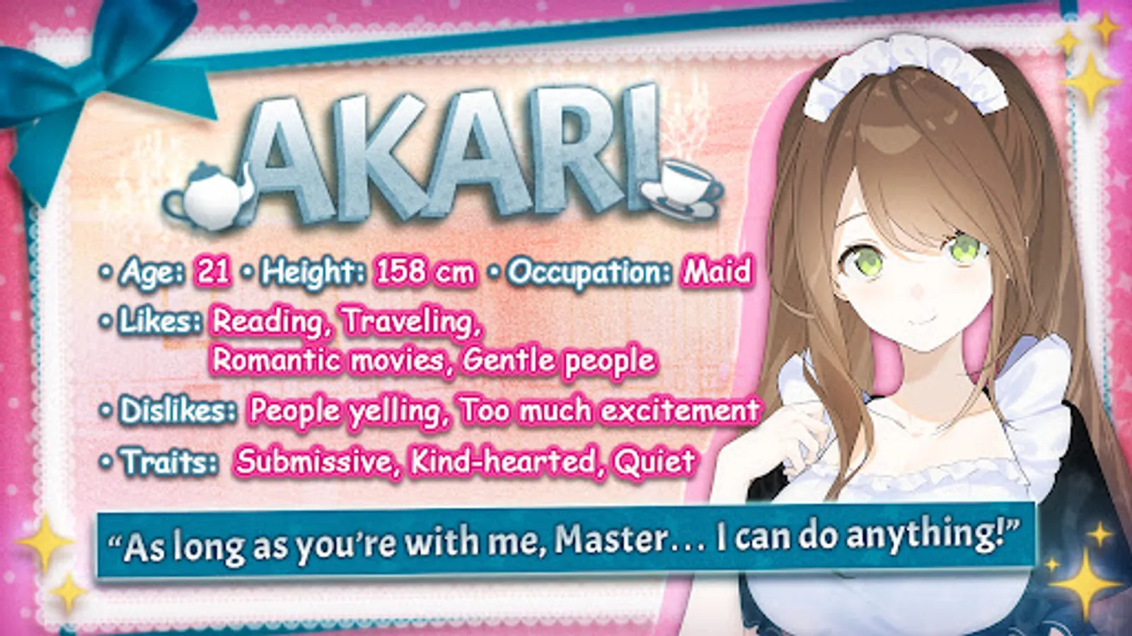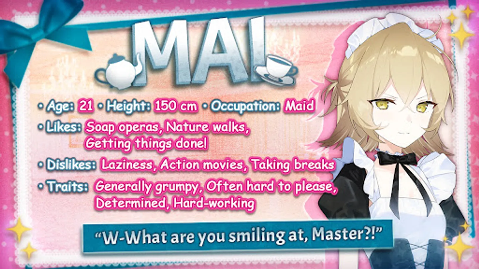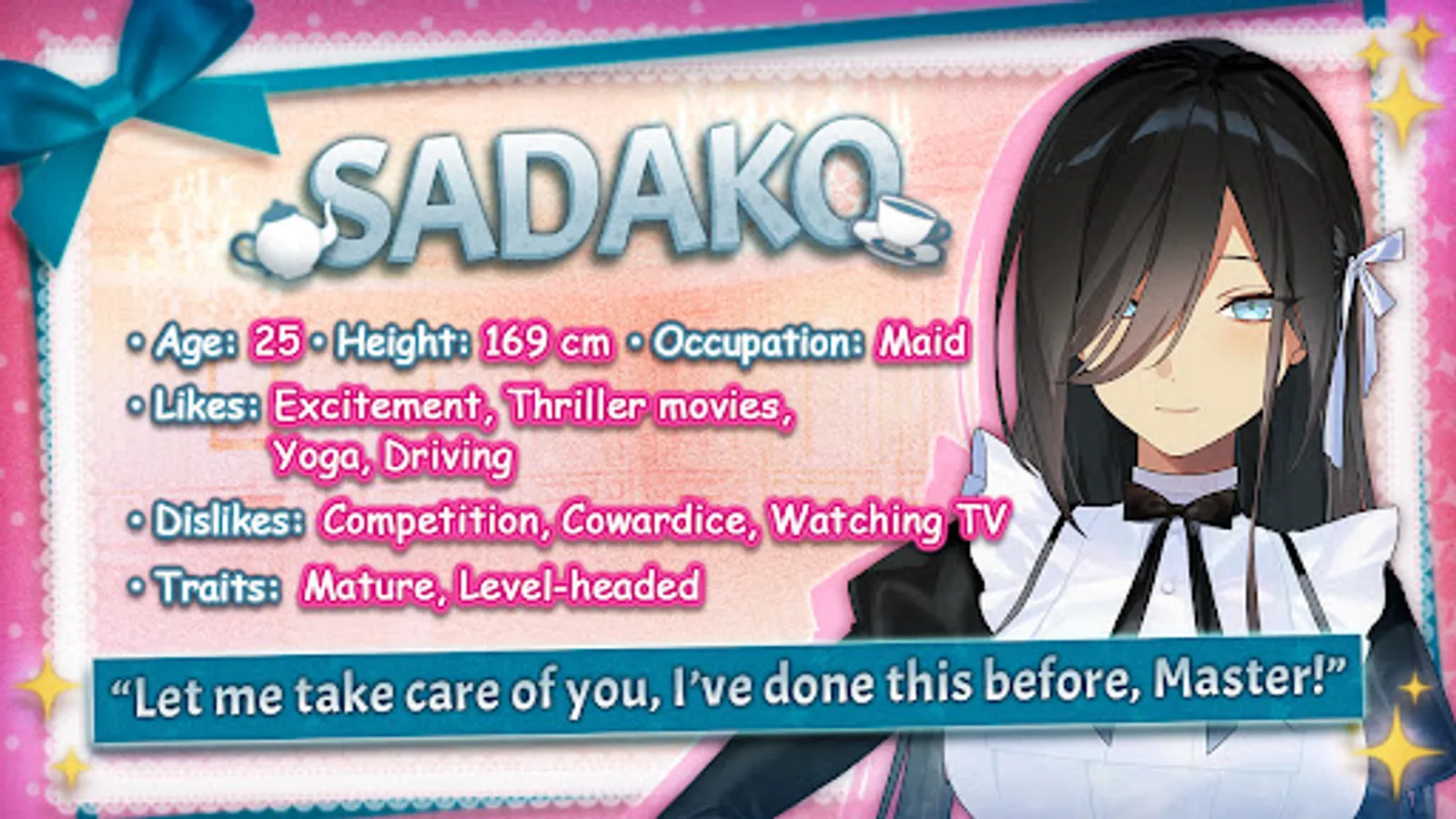 Mature and mysterious, Sadako comes off as a strange, ephemeral being rather than your typical maid. Her presence makes you nervous at first, but you soon find that she’s very agreeable and easy to talk to. The most seasoned of the maids, she often works as the cook to make some of the most delicious meals you've ever tasted. But after spending a good deal of time with her, you realize how rarely she talks about herself…