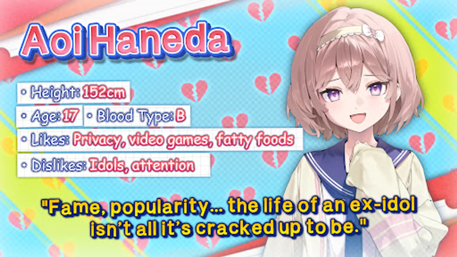 Aoi is a cheerful underclassman who once graced television screens as a beloved child actress and idol. However, her legacy left her bullied by envious classmates and shunned by others intimidated by her fame, giving her a disdain for popularity and a distorted perception of romance.