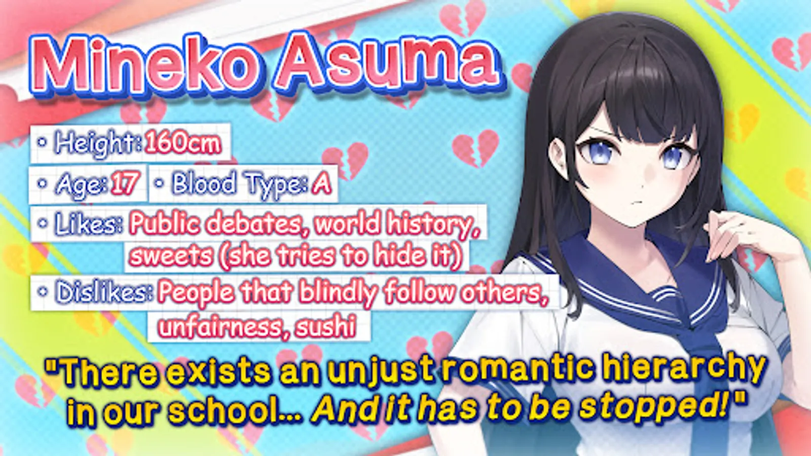 When your attempt to ask out your crush is met with rejection, your classmate Mineko, who recently experienced similar heartbreak, ropes you into joining her visionary anti-romance club. Together, you form a movement to challenge the expectations of teenage romance and ideals, aka the hierarchy of hotness, that Mineko believes students use to determine if someone is worth dating or not. But things take an unexpected turn when she decides to run for student council president—the same position as the crush who rejected you—with the goal of destroying the hierarchy of hotness that plagues your school!