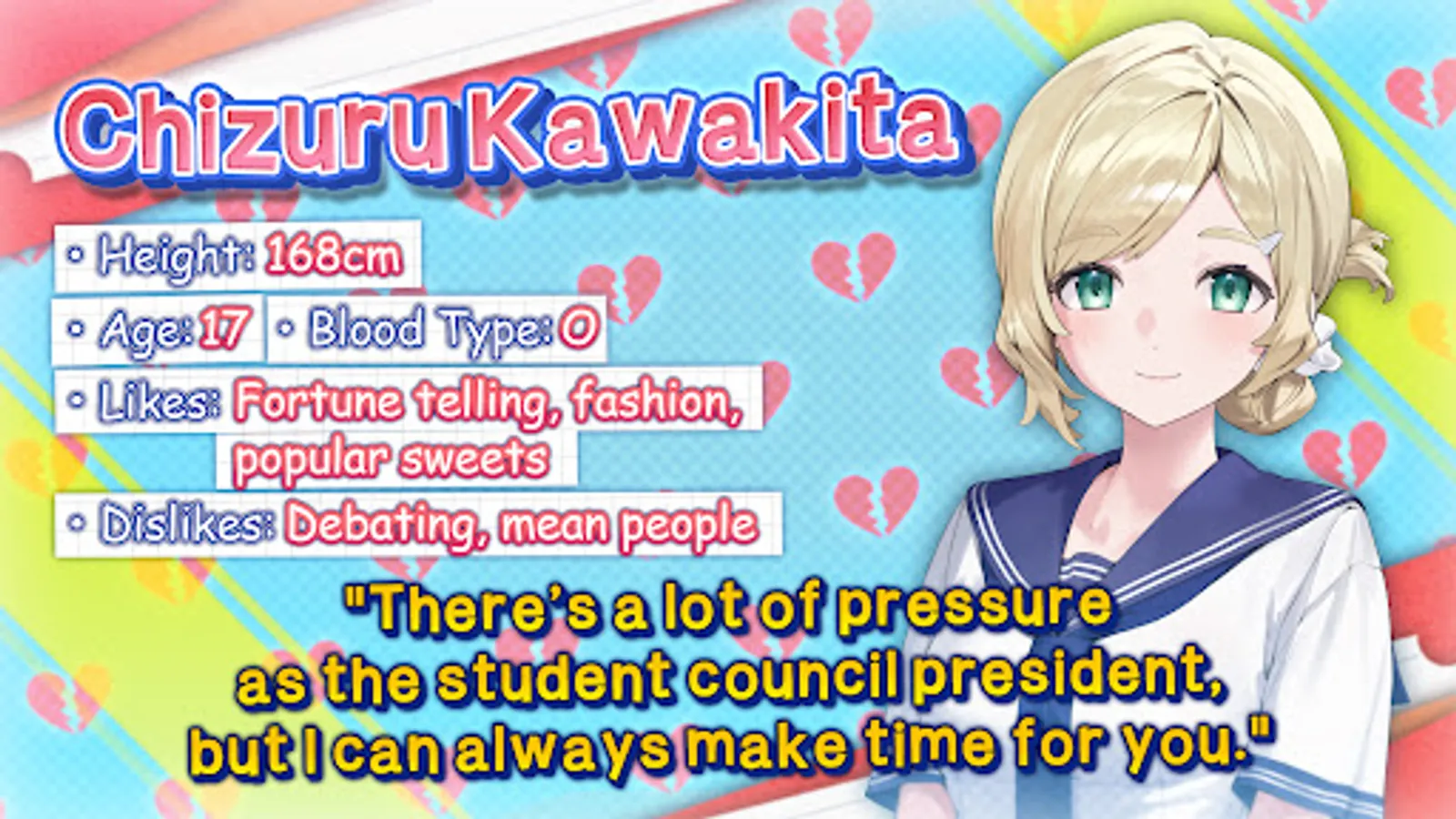 As the esteemed student council president, she seems to lead the perfect life—but a particular secret shows that she longs to experience true love. Will you stay by her side and help lift her burdens, or will her rejection alter your relationship forever?