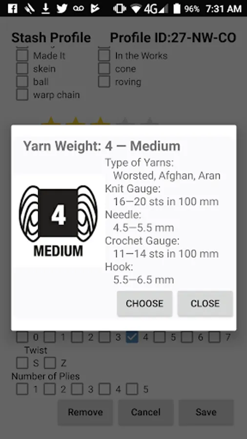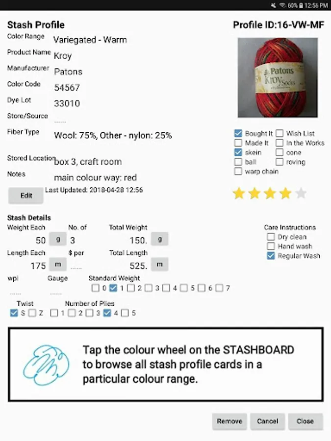 Use the app to browse through, locate, and track your supplies for projects. Note the essential information like colour, fibre type, and where it you store it. You can also track other information such as product info (name, manufacturer, dye lot, etc.), where you bought it, the cost, quantity, length, gauge and twist type, and rate how much you like the stash. It is even designed for people who spin their own.