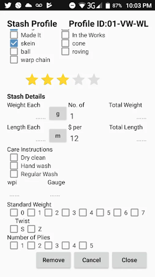 Stash card information can be tracked in metric or imperial. Store unlimited stash cards and backup & restore you data file so you don't lose your information.
