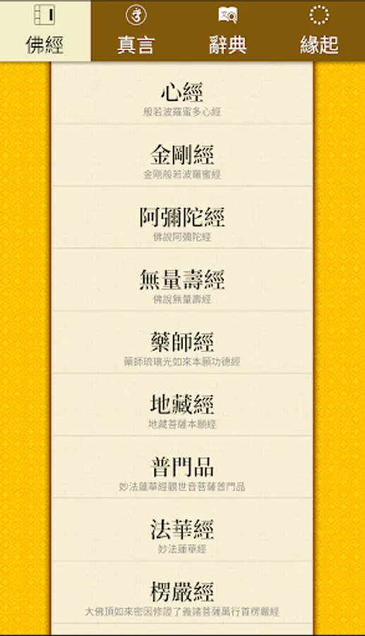 • Scriptures: Contains the Heart Sutra, Diamond Sutra, Amitabha Sutra, Pharmacist Sutra, Lotus Sutra, Shurangama Sutra, Ksitigarbha Sutra, Boundless Life Sutra, Pumenpin, Great Compassion Dharani Sutra, etc. The content of the scriptures is mainly based on the Tripitaka compiled and collected by the Chinese Electronic Buddhist Scripture Association. In order to optimize readers’ understanding, this APP is accompanied by dictionary hints that can be directly clicked to watch the explanation. (The dictionary function is for reference only, the true meaning should be matched with the complete scripture)