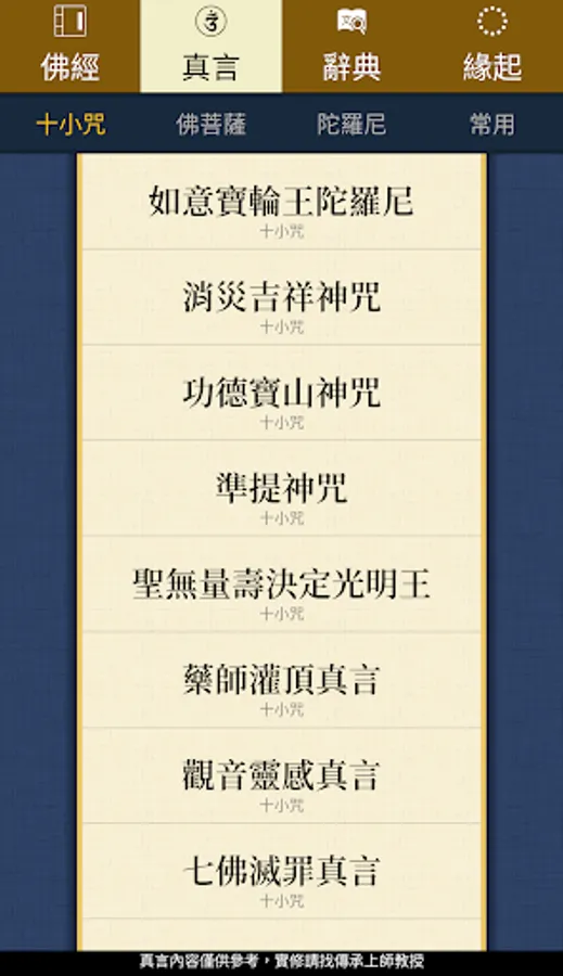 • Mantra: Contains commonly used ten mantras, mantras of various Buddhas and Bodhisattvas, various sutras Dharani (such as Great Compassion Mantra, Shurangama Mantra, etc.), commonly used mantras (such as Jingsan Karma, Bianshi Mantra, etc.), and are attached with Roman pinyin as Pronunciation reference.