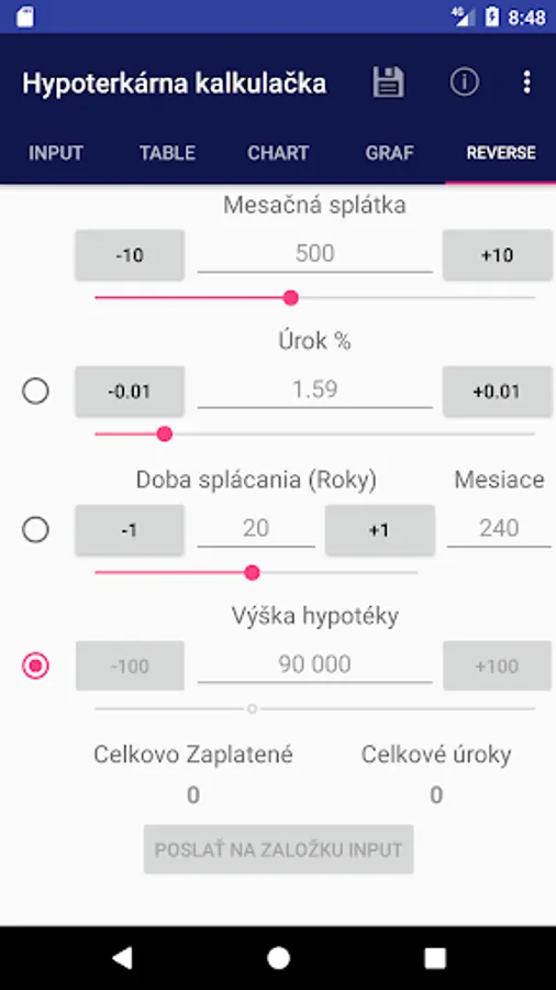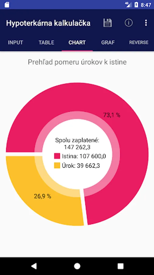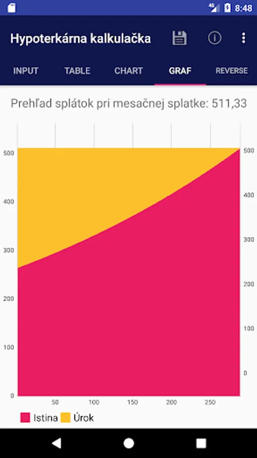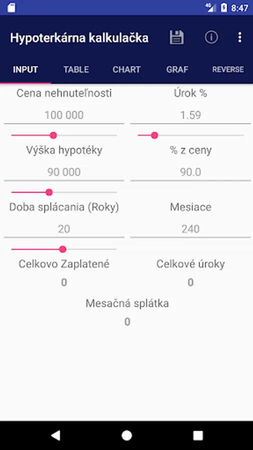 The application is used to calculate monthly mortgage payment and monthly payment display detailed information in the table and in the graph. It is also possible to calculate the monthly payment of interest on the mortgage, the mortgage repayment period and the total amount of the mortgage.