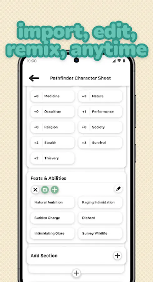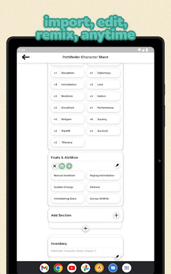 – Character stats, player notes, and inventory logs are always one tap away, with flexible tools for homebrew mechanics and unique gameplay.