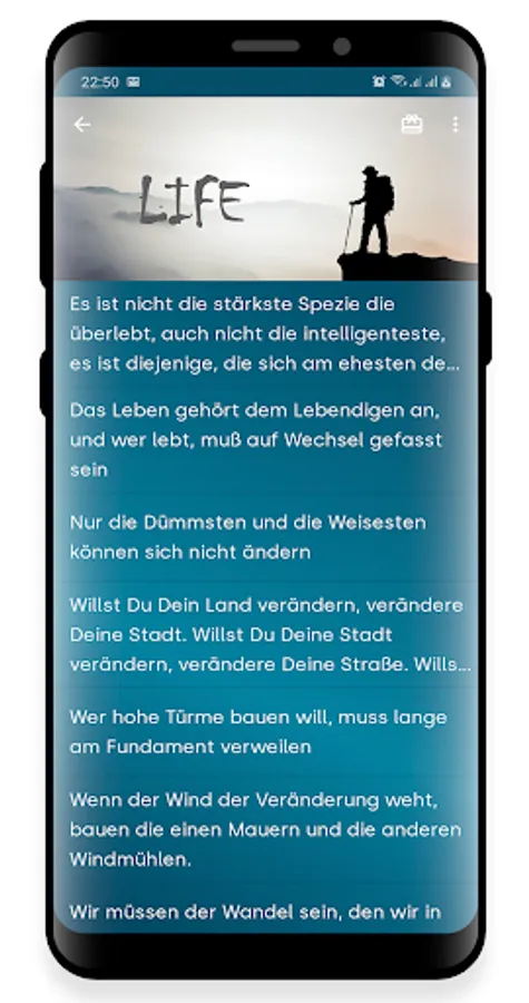 This application shows you a large collection of wise sayings, sayings about life, good sayings, quotes and sayings. Simply browse through our collection, select a suitable quote or phrase and let this act as a mental inspiration for your greetings, add them to your favorites around the