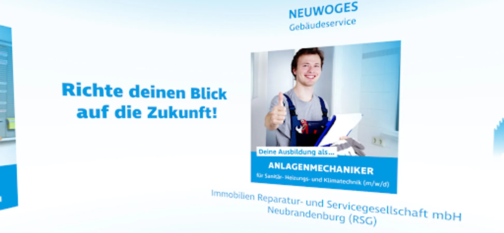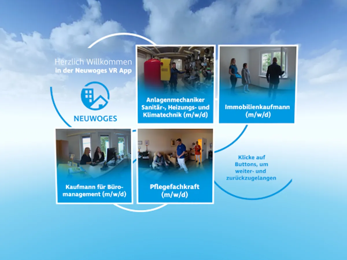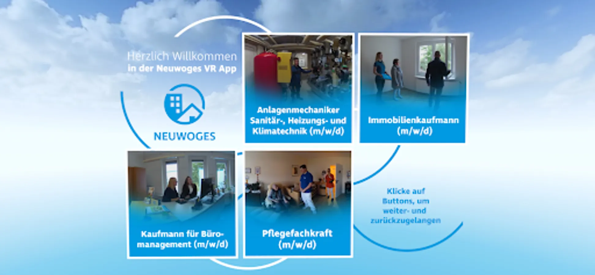 Immerse yourself in the professional world of Neuwoges with the help of VR and immersively get to know different professions. You will be introduced to the professions of nursing specialist (m / f / d), plant mechanic (m / f / d), real estate agent (m / f / d) and office manager (m / f / d).