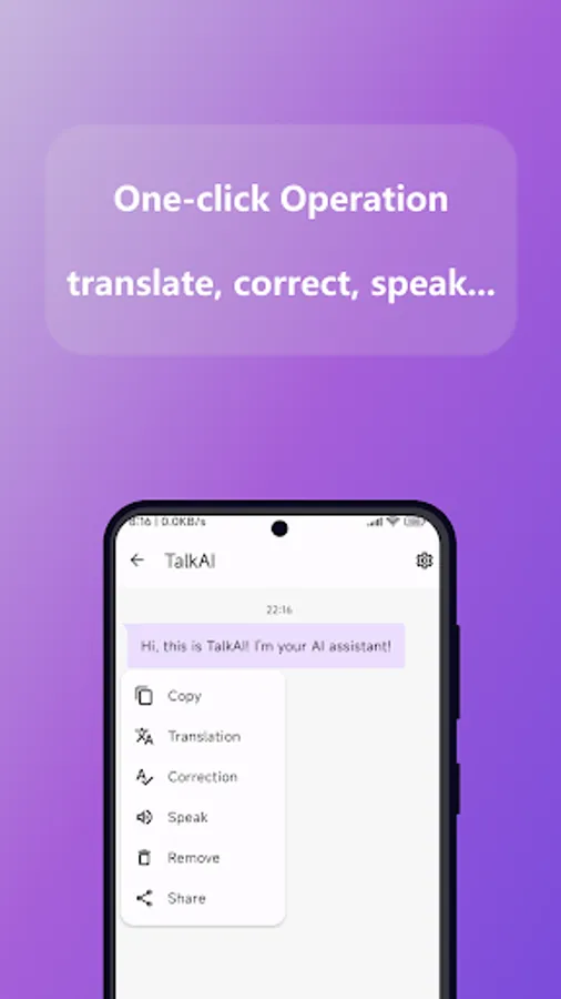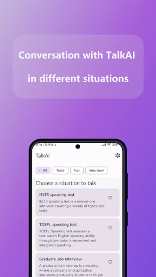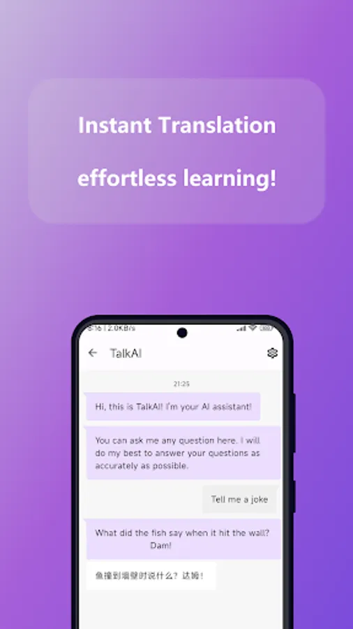 With TalkAI, you can easily learn a new language, communicate with your AI language partner, and no longer feel nervous when communicating with strangers, thus improving your language ability anytime and anywhere.