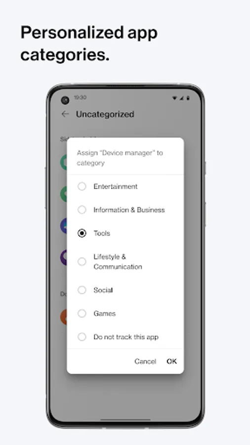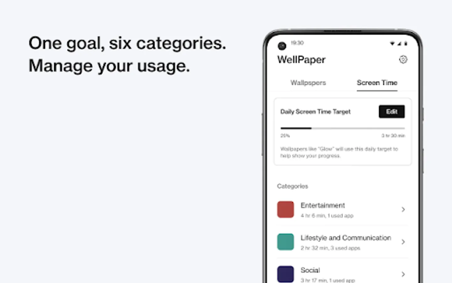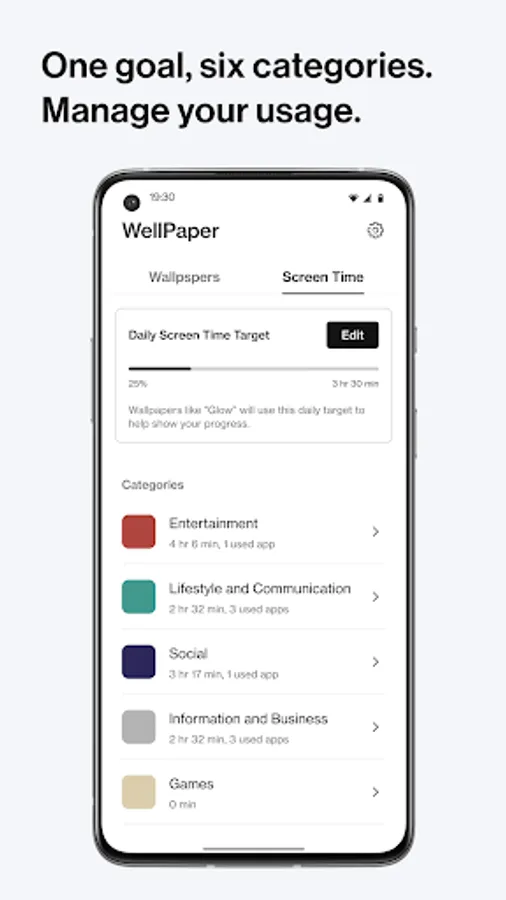 WellPaper takes the many different types of apps on your phone and simplifies them down into 6 categories, so you can easily understand how your time is being used. You can go into the WellPaper app to check which apps belong to each category, manage sideloaded apps, or set your daily screen time target.