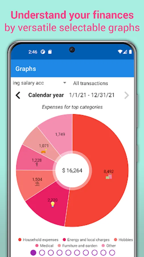 - See graphs of all your spending or zoom in on one category, hashtag or a specific filter you made.