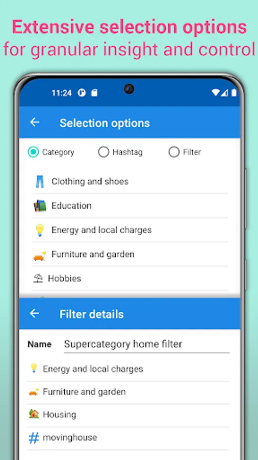 - In advanced filter mode, you can apply logic like: all expenses in category Household but not tagged with #vacation. No other app offers this level of granular scrutiny of your financial data.