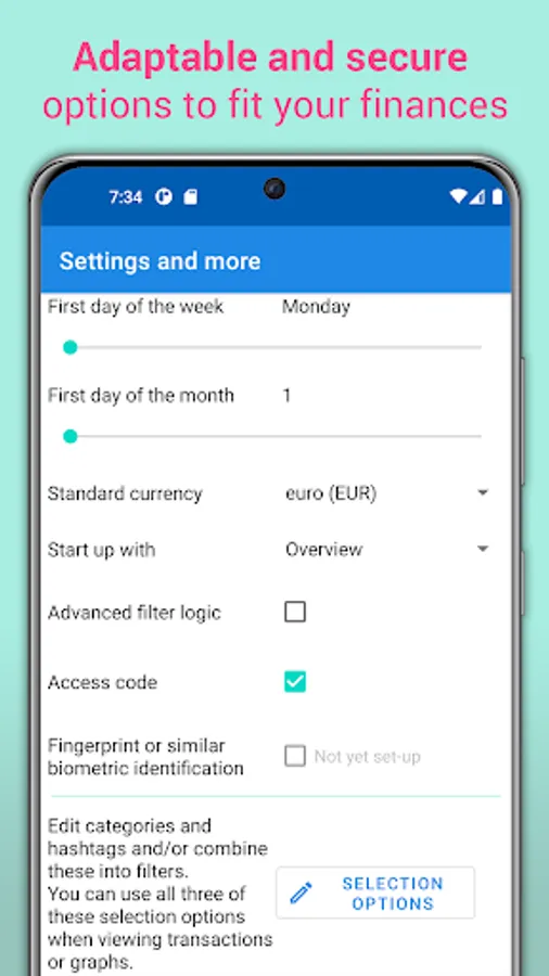 - Set a pincode or fingerprint access, to prevent that your personal financial data can be seen by someone holding your phone e.g. to see your pictures.