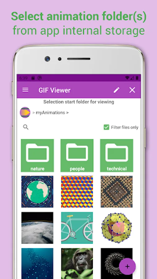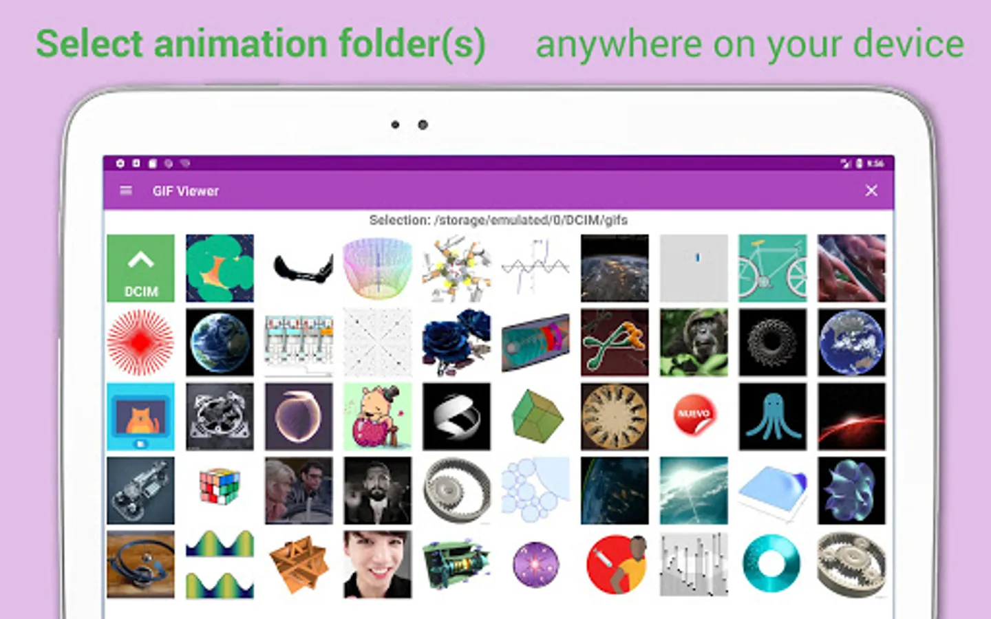 ✔ Animated previews. See all your GIFs play at the same time while browsing a folder (requires a high-end smarthpone for smooth viewing).