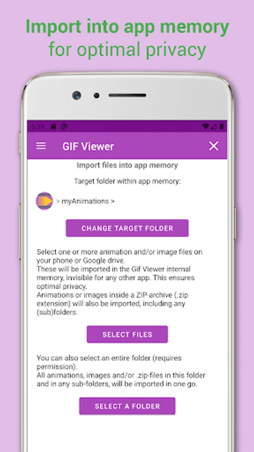 ✔ Optimal privacy, because animations are stored inside the app memory. Nothing is visible for other apps, like Gallery or Files. Nothing is shared with other users. The GIF Viewer app respects your privacy! Bulk Import your collection via a .zip file or selecting an entire folder path at once.